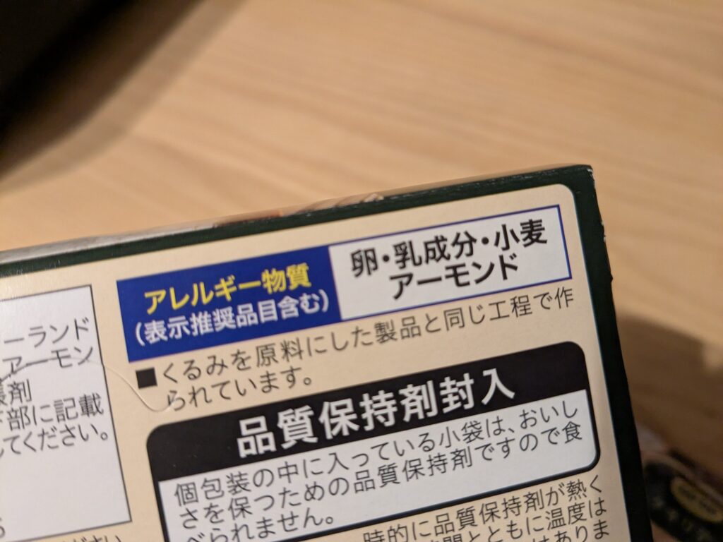 パッケージ側面の記載によると、アレルギー物質(表示推奨品目含む)は「卵・乳成分・小麦・アーモンド」となっています。