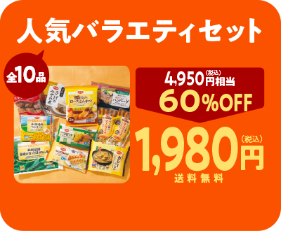 全10品が60%OFFの1,980円(税込)でお試しできる「人気バラエティセット」。